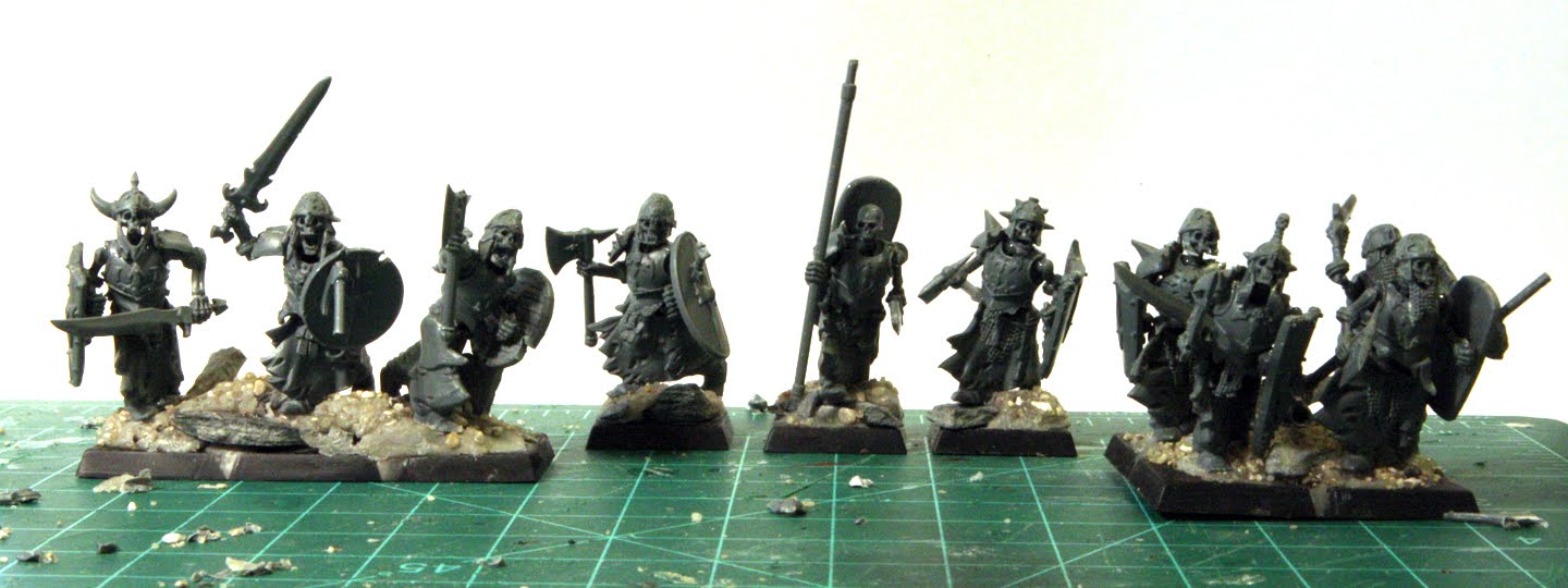 The blogosphere is red hot with discussions about what's better: Fantasy or 40k. One thing is for sure: modeling fantasy is harder....that's what I believe. Making sure 10 models rank up, don't bonk each other over and look different and dynamic is really, really hard for me. Here's the Grave Guard as I just built it up.